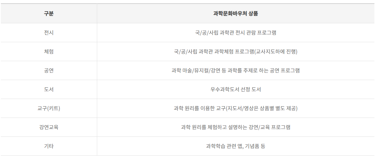 과학문화바우처는 정부가 국민의 과학문화 격차 해소를 위해 추진하는 바우처 형태의 지원제도입니다. 수혜자는 이 바우처를 이용해 과학관, 체험센터, 교육 프로그램, 전시, 공연, 온라인 과학강의 등 다양한 과학문화 활동을 무료 또는 할인된 가격으로 즐길 수 있습니다.