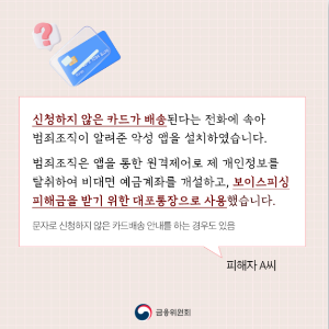 금융기관이나 공공기관은 절대 전화로 개인정보, 금융정보를 요구하지 않습니다. 의심되는 경우 즉시 전화를 끊고 해당 기관에 직접 문의하세요.