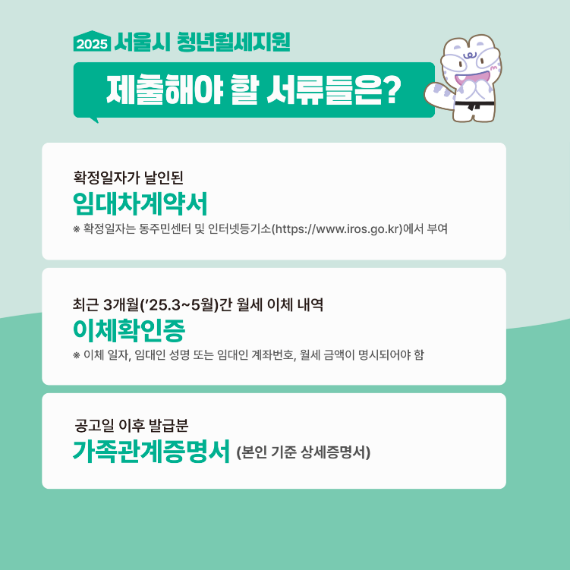 자세한 내용과 서류는 서울주거포털 홈페이지 내 ‘청년월세지원’ 공고문을 꼭 참고해 주세요.