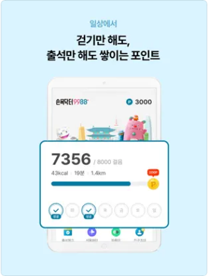 - 하루 8,000보(70세 이상은 5,000보) 달성 시 포인트 적립 (200P)
