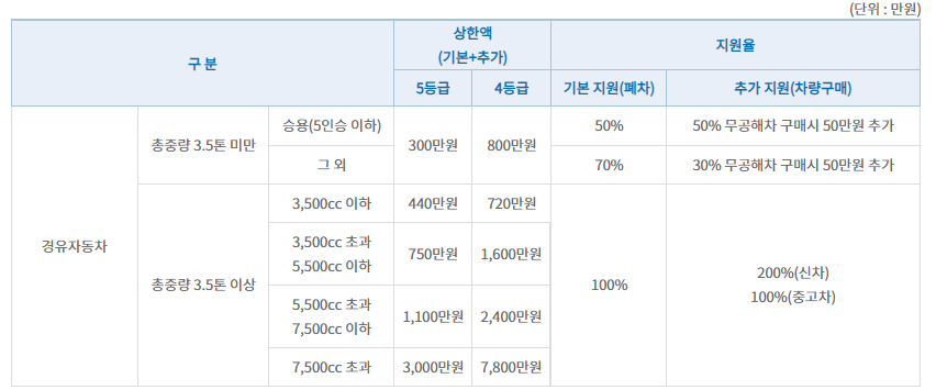 | 추가 지원금 | 신차 또는 저공해차 구매 시 추가 보조 | 최대 600만 원 |
