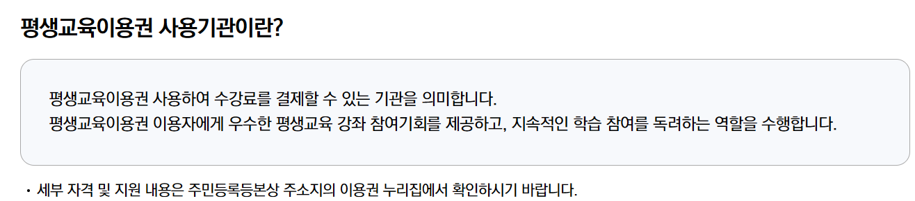 다만, 사용처는 국가평생교육진흥원에 등록된 '이용권 사용기관'으로 한정되므로, 수강 전 반드시 확인이 필요합니다.