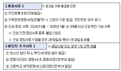 - 제출서류 : 신청서, 주민등록등본, 근로확인서류, 소득증빙 등